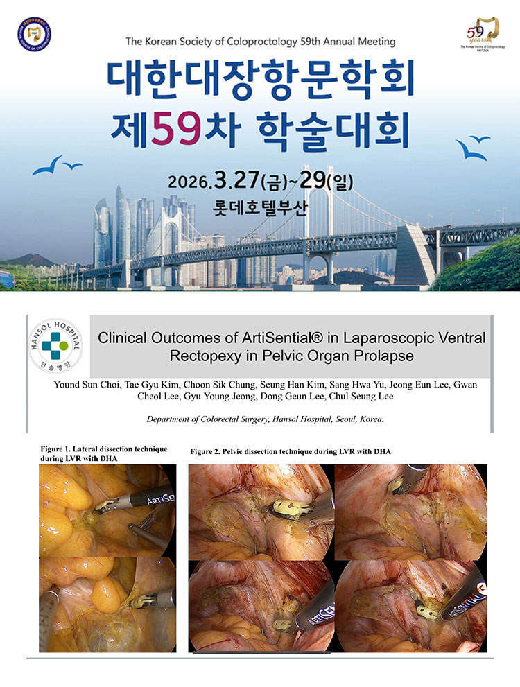 대장항문외과 이철승 부원장 2026 대한대장항문학회 제59차 학술대회 의료진 포스터 발표 2026.03.27~29 포스터 발표 · Clinical Outcomes of ArtiSential® in Laparoscopic Ventral Rectopexy in Pelvic Organ Prolapse (대장항문외과 이철승 부원장 / 최영선 진료과장)