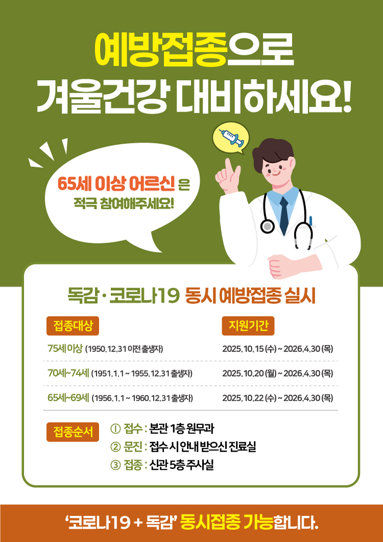 2025 인플루엔자(독감), 코로나19 동시접종 실시 안내드립니다. - 75세 이상 (1950.12.31 이전 출생자) ▶ 접종기간 : 2025.10.15 ~ 2026.04.30 - 70세~74세 (1949.1.1 ~ 1953.12.31 출생자) ▶ 접종기간 : 2025.10.20 ~ 2026.04.30 - 65세~69세 (1954.1.1 ~ 1958.12.31 출생자) ▶ 접종기간 : 2025.10.22 ~ 2026.04.30 본원에서는 유료 독감백신 접종도 진행하고 있습니다. 예방접종으로 겨울건강 미리미리 준비하세요~ |
