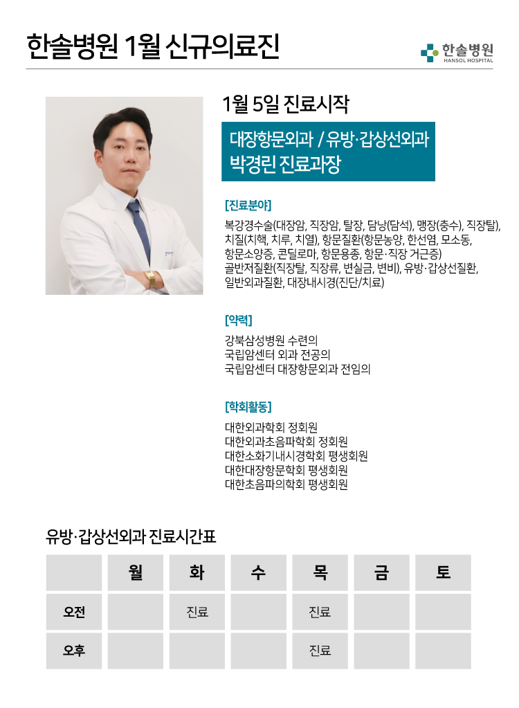 2026년 1월 5일부터 대장항문외과 / 유방갑상선외과 박경린 진료과장이 진료를 시작합니다.