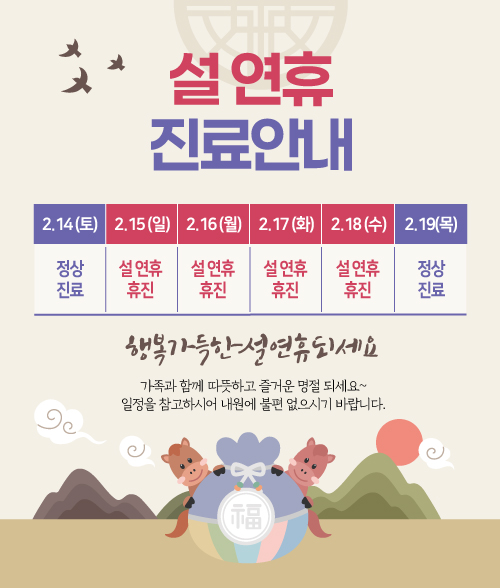 | 비고 | 토요일 진료: 1주차 08:00~12:00 / 3주차 08:00~12:00 | |||||