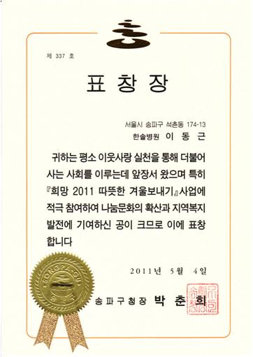 사회공헌활동 표창장 수상 (송파구청) 한솔병원 전직원은 지난 2010년 12월~2011년 2월까지 추진된 '희망 2011 따뜻한 겨울보내기' 성금 모금에 동참하여, 송파구청으로부터 표창장을 전달 받았습니다. 앞으로도 이웃과 함께 따뜻한 마음을 나누고 모든 고객을 내 가족이라 생각하며 더욱 정성을 다하는 한솔병원이 되기 위해 노력하겠습니다. 고맙습니다.
