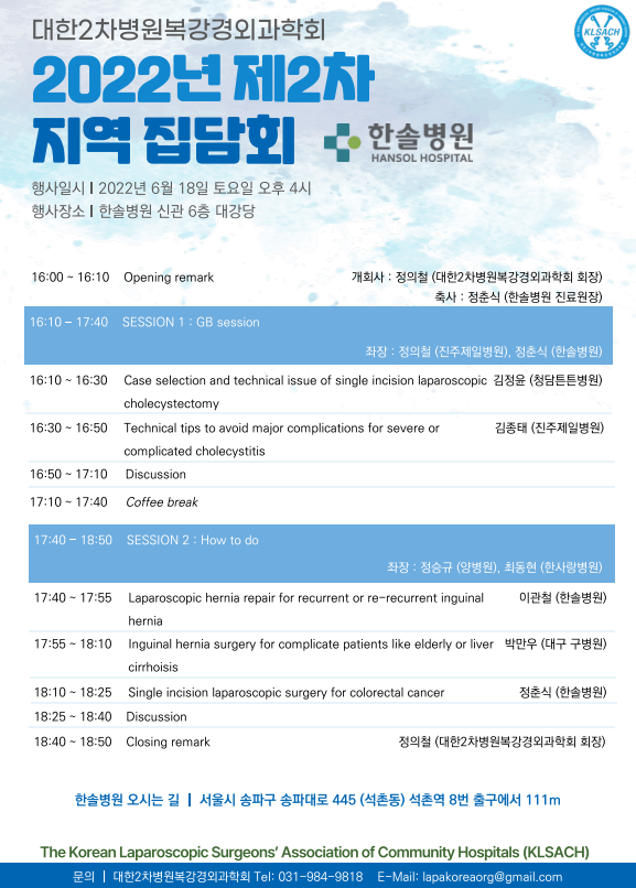 한솔병원에서는 오는 6월 18일 토요일 오후 4시 <2022년 제2회 대한2차병원 복강경외과학회 지역집담회>가 개최될 예정입니다. 대한2차병원복강경외과학회는 각종 심포지엄을 개최하여 2차병원 의료진이 시행하는 복강경 수술 기법 등에 대한 교류 등 2차병원 간의 최신 의료정보를 나누며 의료 발전을 위해 노력하고 있습니다. 이번 집담회는 총 2개의 세션으로 나뉘어 진행될 예정이며 한솔병원 외과 전문의를 포함하여 여러 의료진의 사례와 연구결과를 바탕으로 심포지엄을 개최합니다. 1) Case selection and technical issue of single incision laparoscopic cholecystectomy (김정윤 청담 튼튼 병원) 2) Technical tips to avoid major complications fod severe or complicated cholecystitis (김종태 진주제일병원) 1) Laparoscopic hernia repair for recurrent or re-recurrent inguinal hernia (이관철 한솔병원) 2) Inguinal hernia surgery for complicate patients like elderdly or liver cirrhosis (박만우 대구 구병원) 3) Single incision laparoscopic surgery for colorectal cancer (정춘식 한솔병원) <프로그램 표>