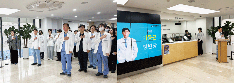 이번 월례조회는 국민의례, 병원장님 인사말, 신입직원 소개, 승진발령, 2025년 하반기 친절직원 시상, 로봇/복강경수술센터 준공 진행사항 순서로 진행했습니다.