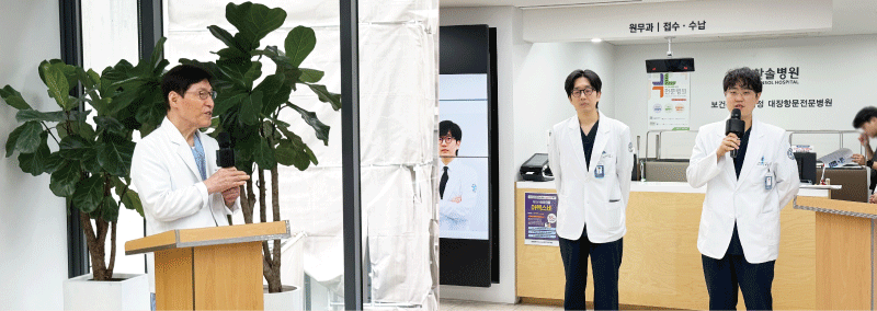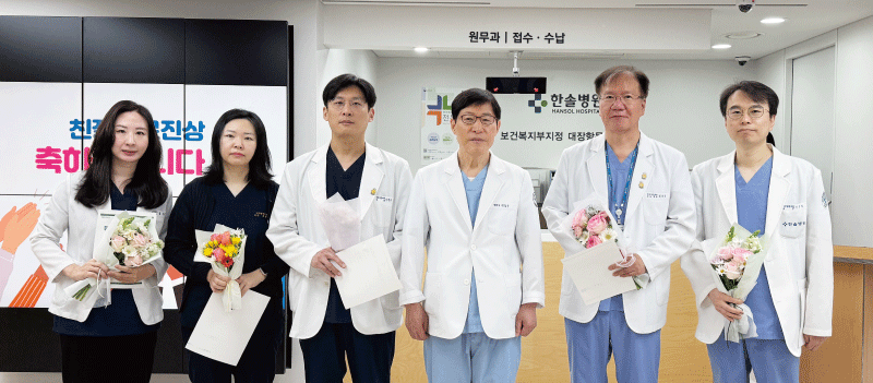 한솔 마음까지 치료상 2025년 하반기 동안 전문성과 친절을 겸비하고 마음까지 치유하여 환자들에게 감동을 준 의료진 <대장항문외과 이철승 부원장, 정춘식 진료원장, 소화기내과 김지원 진료과장> 한솔 따뜻한 손길상 2025년 하반기 동안 세심하고 따뜻한 배려와 공감으로 환자들에게 감동을 준 의료진 <대장항문외과 이관철 진료부장, 최영선 진료과장> 한솔 환한 미소상 2025년 하반기 동안 밝고 친절한 미소로 환자들에게 감동을 준 의료진 <순환기내과 권오훈 진료부원장>