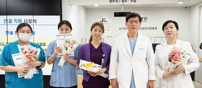 이동근 병원장님은 로봇/복강경수술센터 6월 완공을 앞두고 모두가 새로운 마음을 갖고, 조금 더 발전된 모습으로 임해주길 바란다고 말씀하셨습니다. 이어서 신규로 입사하신 대장항문외과 임현태 진료과장, 소화기내과 문준석 진료과장, 수술실 최미란 책임간호사 소개와 함께 4월 1일자로 승진 발령된 내시경실 김은솔 수간호사, 경영지원실 박상혁 주임 모두 축하하는 시간을 가졌습니다. 이번 월례조회의 하이라이트였던 하반기 친절직원 시상은 단순히 친절한 태도뿐만 아니라, 환자 한 분 한 분의 마음을 세심히 살펴주신 직원들의 노고를 격려하고자 마련되었습니다. 선정 과정은 홈페이지·고객소리함·모바일 설문지로 접수된 환자 의견을 전부 취합 및 분석하여, 실제 환자분들의 칭찬 빈도와 구체적인 사례를 종합적으로 검토하였으며, 이를 바탕으로 공정하게 선정되었습니다. 특히 이번에 선정된 친절직원 분들께는 상장, 상금, 꽃다발과 함께 친절직원 뱃지가 수여되었습니다. 이 뱃지는 환자분들께 받은 신뢰와 따뜻한 마음을 상징합니다. 앞으로도 환자 한 분 한 분께 감동을 전하는 모습이 더욱 빛나길 기대합니다 :)