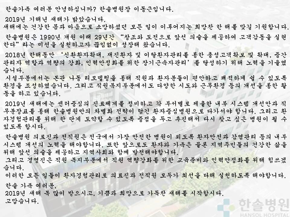보건복지부 인증의료기관 한솔병원은 1월 2일 전직원이 참석 아래 신관 6층 한솔아트홀에서 2019 기해년 시무식을 가졌습니다. 이동근 병원장은 "전국에서 가장 안전한 병원이 되도록 환자안전과 감염관리 등의 내부 시스템 개선의 노력을 해야하며, 앞으로도 환자와 가족은 물론 지역주민들의 건강한 삶을 위해 앞선 의술을 제공하고 지역사회와 함께 발전해야한다"고 말했습니다. 전직원은 '미션 및 비전', '우리의 다짐'을 낭독 후 새해맞이 덕담나누기를 통해 새마음으로 2019년에도 지역사회와 함께 성장할 수 있도록 다짐하는 시간을 가졌습니다.